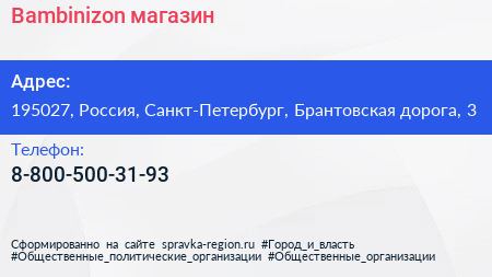 Bambinizon, магазин по адресу 195027, Россия, Санкт-Петербург, Брантовская дорога, 3 в дальнейшем Организация, размещена в следующих категориях: