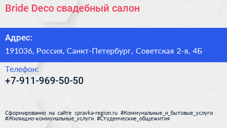 Bride Deco, свадебный салон по адресу 191036, Россия, Санкт-Петербург, Советская 2-я, 4Б в дальнейшем Организация, размещена в следующих категориях: