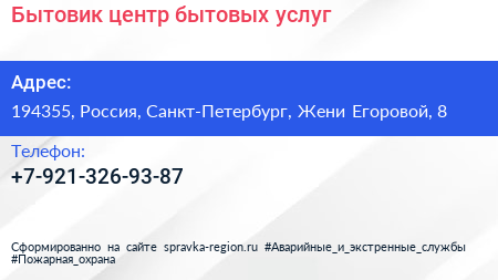 Бытовик, центр бытовых услуг по адресу 194355, Россия, Санкт-Петербург, Жени Егоровой, 8 в дальнейшем Организация, размещена в следующих категориях: