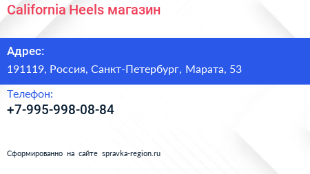 California Heels, магазин по адресу 191119, Россия, Санкт-Петербург, Марата, 53 в дальнейшем Организация, размещена в следующих категориях: