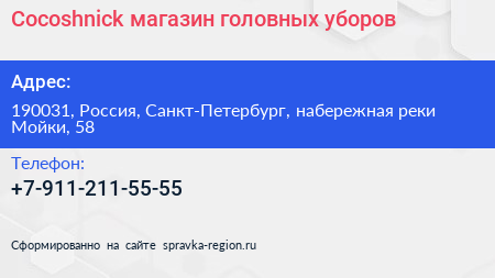 Cocoshnick, магазин головных уборов по адресу 190031, Россия, Санкт-Петербург, набережная реки Мойки, 58 в дальнейшем Организация, размещена в следующих категориях: