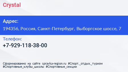 Crystal по адресу 194356, Россия, Санкт-Петербург, Выборгское шоссе, 7 в дальнейшем Организация, размещена в следующих категориях: