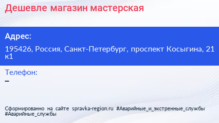 Дешевле, магазин-мастерская по адресу 195426, Россия, Санкт-Петербург, проспект Косыгина, 21 к1 в дальнейшем Организация, размещена в следующих категориях: