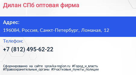 Дилан СПб, оптовая фирма по адресу 196084, Россия, Санкт-Петербург, Ломаная, 12 в дальнейшем Организация, размещена в следующих категориях: