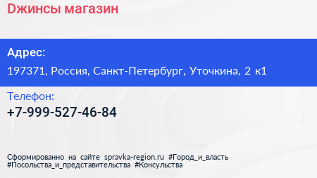 Dжинсы, магазин по адресу 197371, Россия, Санкт-Петербург, Уточкина, 2 к1 в дальнейшем Организация, размещена в следующих категориях: