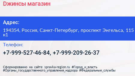 Dжинсы, магазин по адресу 194354, Россия, Санкт-Петербург, проспект Энгельса, 115 к1 в дальнейшем Организация, размещена в следующих категориях: