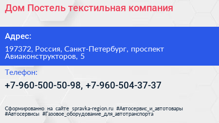 Дом-Постель, текстильная компания по адресу 197372, Россия, Санкт-Петербург, проспект Авиаконструкторов, 5 в дальнейшем Организация, размещена в следующих категориях: