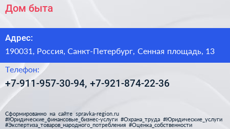 Дом быта по адресу 190031, Россия, Санкт-Петербург, Сенная площадь, 13 в дальнейшем Организация, размещена в следующих категориях: