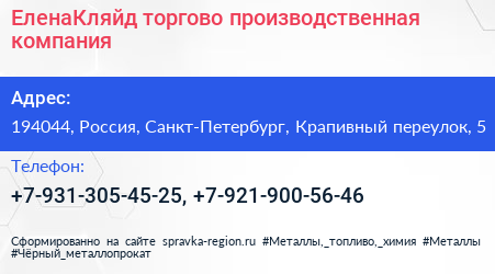 ЕленаКляйд, торгово-производственная компания по адресу 194044, Россия, Санкт-Петербург, Крапивный переулок, 5 в дальнейшем Организация, размещена в следующих категориях:
