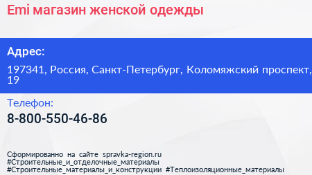 Emi, магазин женской одежды по адресу 197341, Россия, Санкт-Петербург, Коломяжский проспект, 19 в дальнейшем Организация, размещена в следующих категориях: