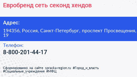 Евробренд, сеть секонд-хендов по адресу 194356, Россия, Санкт-Петербург, проспект Просвещения, 19 в дальнейшем Организация, размещена в следующих категориях: