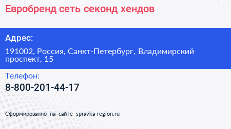 Евробренд, сеть секонд-хендов по адресу 191002, Россия, Санкт-Петербург, Владимирский проспект, 15 в дальнейшем Организация, размещена в следующих категориях: