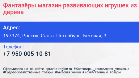 Фантазёры, магазин развивающих игрушек из дерева по адресу 197374, Россия, Санкт-Петербург, Беговая, 3 в дальнейшем Организация, размещена в следующих категориях: