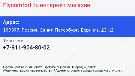 Flycomfort.ru, интернет-магазин по адресу 199397, Россия, Санкт-Петербург, Беринга, 23 к2 в дальнейшем Организация, размещена в следующих категориях: