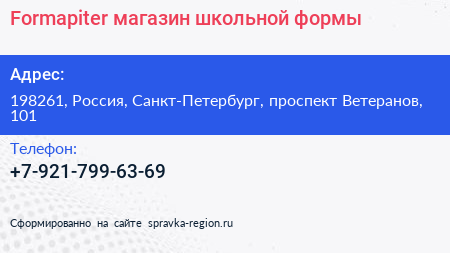 Formapiter, магазин школьной формы по адресу 198261, Россия, Санкт-Петербург, проспект Ветеранов, 101 в дальнейшем Организация, размещена в следующих категориях: