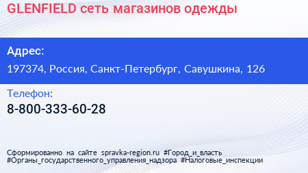 GLENFIELD, сеть магазинов одежды по адресу 197374, Россия, Санкт-Петербург, Савушкина, 126 в дальнейшем Организация, размещена в следующих категориях: