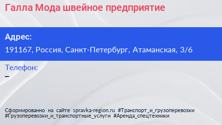 Галла Мода, швейное предприятие по адресу 191167, Россия, Санкт-Петербург, Атаманская, 3/6 в дальнейшем Организация, размещена в следующих категориях: