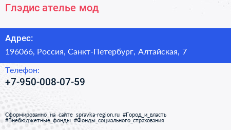Глэдис, ателье мод по адресу 196066, Россия, Санкт-Петербург, Алтайская, 7 в дальнейшем Организация, размещена в следующих категориях: