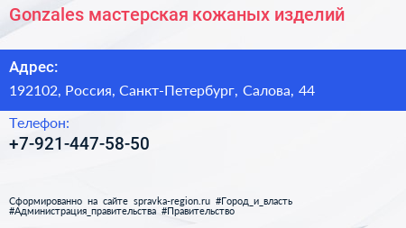 Gonzales, мастерская кожаных изделий по адресу 192102, Россия, Санкт-Петербург, Салова, 44 в дальнейшем Организация, размещена в следующих категориях: