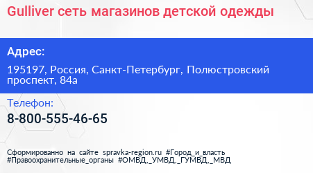 Gulliver, сеть магазинов детской одежды по адресу 195197, Россия, Санкт-Петербург, Полюстровский проспект, 84а в дальнейшем Организация, размещена в следующих категориях: