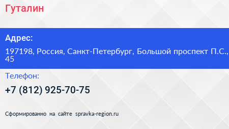 Гуталин по адресу 197198, Россия, Санкт-Петербург, Большой проспект П.С., 45 в дальнейшем Организация, размещена в следующих категориях: