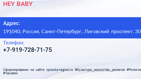 HEY, BABY! по адресу 191040, Россия, Санкт-Петербург, Лиговский проспект, 30 в дальнейшем Организация, размещена в следующих категориях: