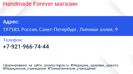 Handmade Forever, магазин по адресу 197183, Россия, Санкт-Петербург, Липовая аллея, 9 в дальнейшем Организация, размещена в следующих категориях: