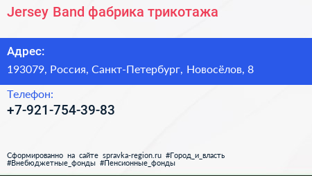 Jersey Band, фабрика трикотажа по адресу 193079, Россия, Санкт-Петербург, Новосёлов, 8 в дальнейшем Организация, размещена в следующих категориях: