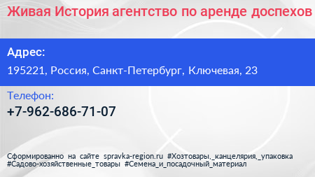 Живая История, агентство по аренде доспехов по адресу 195221, Россия, Санкт-Петербург, Ключевая, 23 в дальнейшем Организация, размещена в следующих категориях: