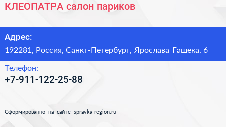 КЛЕОПАТРА, салон париков по адресу 192281, Россия, Санкт-Петербург, Ярослава Гашека, 6 в дальнейшем Организация, размещена в следующих категориях: