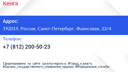 Кенга по адресу 192019, Россия, Санкт-Петербург, Фаянсовая, 22/4 в дальнейшем Организация, размещена в следующих категориях: