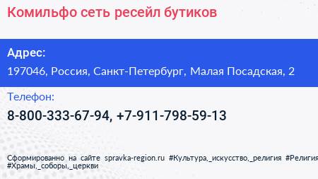 Комильфо, сеть ресейл-бутиков по адресу 197046, Россия, Санкт-Петербург, Малая Посадская, 2 в дальнейшем Организация, размещена в следующих категориях: