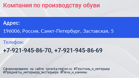 Компания по производству обуви по адресу 196006, Россия, Санкт-Петербург, Заставская, 5 в дальнейшем Организация, размещена в следующих категориях: