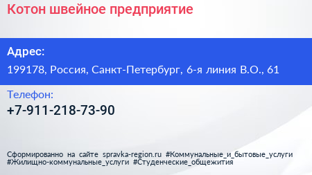 Котон, швейное предприятие по адресу 199178, Россия, Санкт-Петербург, 6-я линия В.О., 61 в дальнейшем Организация, размещена в следующих категориях: