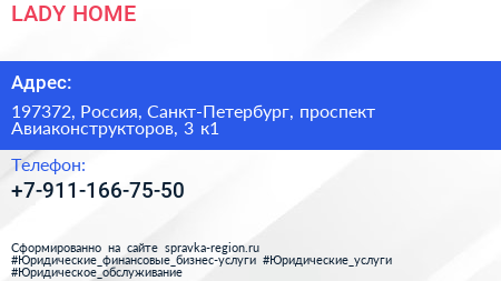 LADY HOME по адресу 197372, Россия, Санкт-Петербург, проспект Авиаконструкторов, 3 к1 в дальнейшем Организация, размещена в следующих категориях: