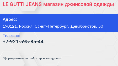 LE-GUTTI JEANS, магазин джинсовой одежды по адресу 190121, Россия, Санкт-Петербург, Декабристов, 50 в дальнейшем Организация, размещена в следующих категориях: