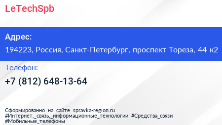 LeTechSpb по адресу 194223, Россия, Санкт-Петербург, проспект Тореза, 44 к2 в дальнейшем Организация, размещена в следующих категориях: