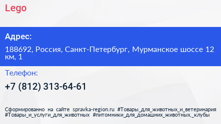 Lego по адресу 188692, Россия, Санкт-Петербург, Мурманское шоссе 12 км, 1 в дальнейшем Организация, размещена в следующих категориях: