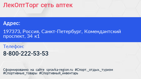 ЛекОптТорг, сеть аптек по адресу 197373, Россия, Санкт-Петербург, Комендантский проспект, 34 к1 в дальнейшем Организация, размещена в следующих категориях: