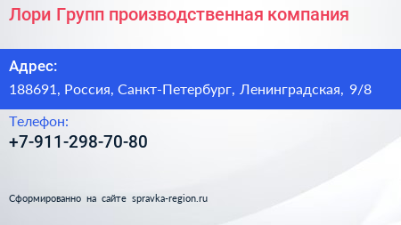 Лори Групп, производственная компания по адресу 188691, Россия, Санкт-Петербург, Ленинградская, 9/8 в дальнейшем Организация, размещена в следующих категориях:
