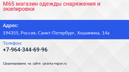 М65, магазин одежды, снаряжения и экипировки по адресу 194355, Россия, Санкт-Петербург, Хошимина, 14а в дальнейшем Организация, размещена в следующих категориях:
