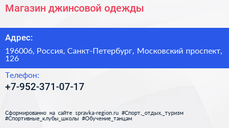 Магазин джинсовой одежды по адресу 196006, Россия, Санкт-Петербург, Московский проспект, 126 в дальнейшем Организация, размещена в следующих категориях: