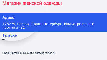 Магазин женской одежды по адресу 195279, Россия, Санкт-Петербург, Индустриальный проспект, 32 в дальнейшем Организация, размещена в следующих категориях: