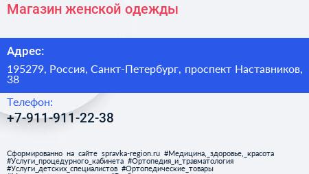 Магазин женской одежды по адресу 195279, Россия, Санкт-Петербург, проспект Наставников, 38 в дальнейшем Организация, размещена в следующих категориях: