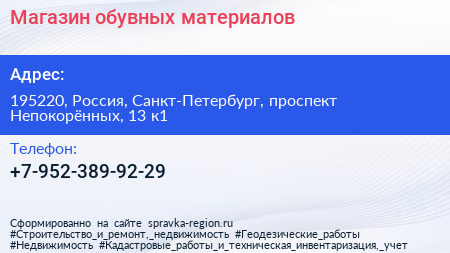 Магазин обувных материалов по адресу 195220, Россия, Санкт-Петербург, проспект Непокорённых, 13 к1 в дальнейшем Организация, размещена в следующих категориях: