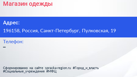 Магазин одежды по адресу 196158, Россия, Санкт-Петербург, Пулковская, 19 в дальнейшем Организация, размещена в следующих категориях: