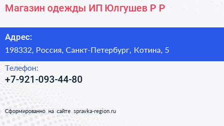 Магазин одежды, ИП Юлгушев Р.Р. по адресу 198332, Россия, Санкт-Петербург, Котина, 5 в дальнейшем Организация, размещена в следующих категориях: