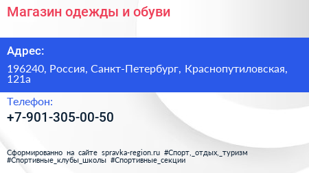 Магазин одежды и обуви по адресу 196240, Россия, Санкт-Петербург, Краснопутиловская, 121а в дальнейшем Организация, размещена в следующих категориях: