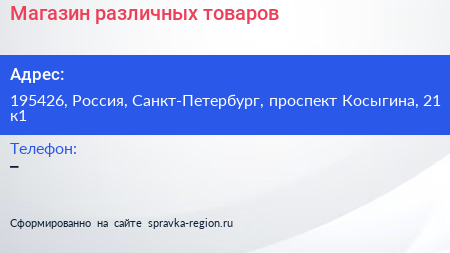 Магазин различных товаров по адресу 195426, Россия, Санкт-Петербург, проспект Косыгина, 21 к1 в дальнейшем Организация, размещена в следующих категориях: