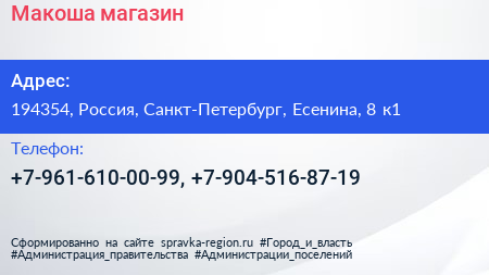 Макоша, магазин по адресу 194354, Россия, Санкт-Петербург, Есенина, 8 к1 в дальнейшем Организация, размещена в следующих категориях:
